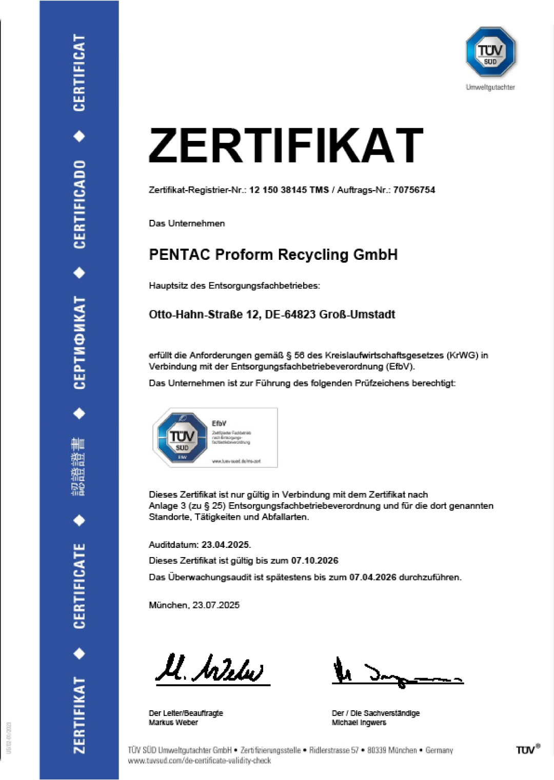 Pentac Proform Recycling GmbH is your competent partner for sustainable plastic solutions. As part of the Pentac Group, we combine many years of experience in plastics processing with state-of-the-art recycling technology.